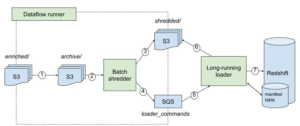 - Shredder: Spark batch job reading enriched events from S3 and writing shredded data to S3. Needs to be orchestrated by an external app (e.g. dataflow-runner). When shredder is done, it writes a message to SQS with the details about shredded data on S3. Each execution writes one message to SQS.
