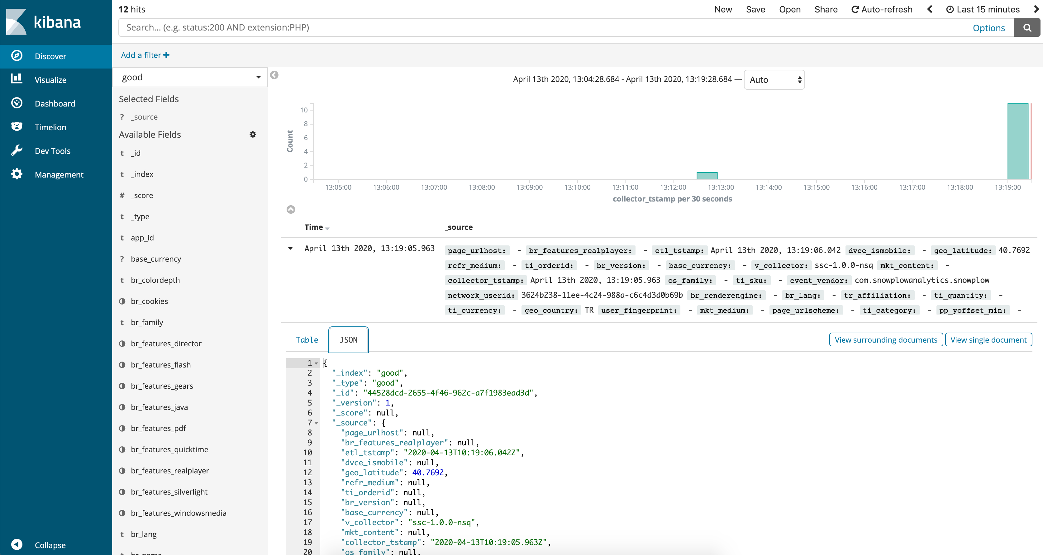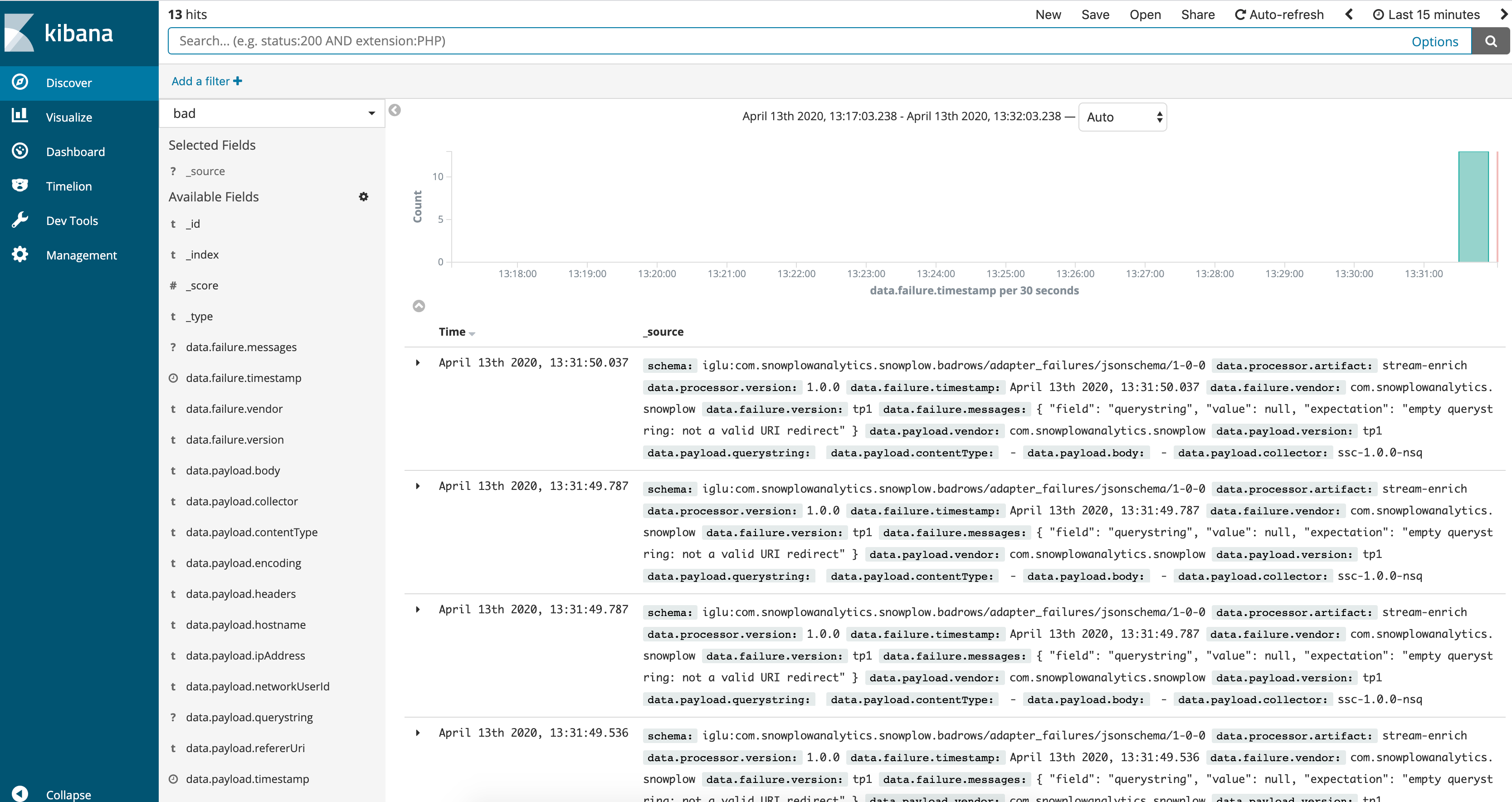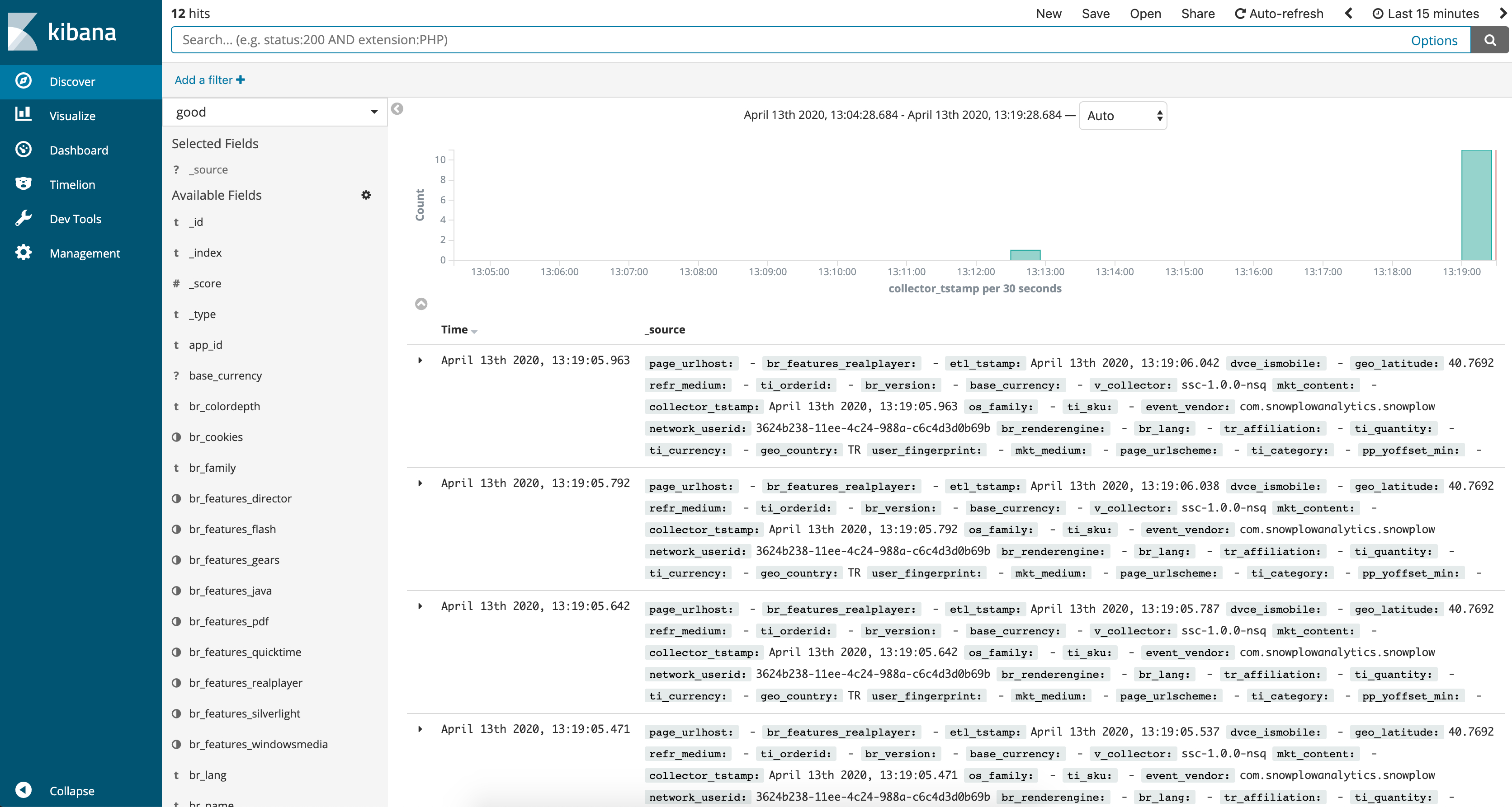 good: For good events, indexed oncollector_tstampbad: For bad events, indexed indata.failure.timestamp