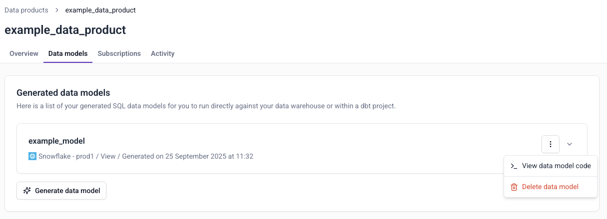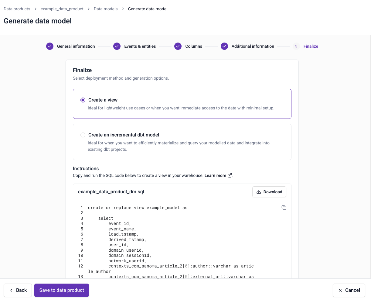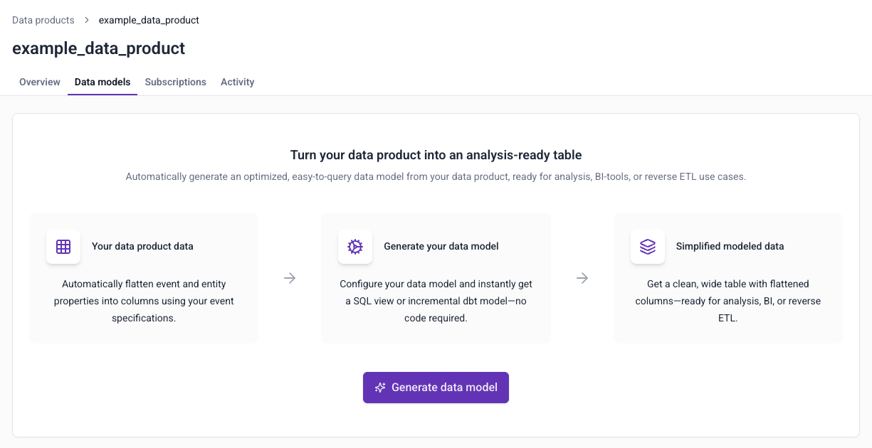 Automatic data model generation allows you to generate optimized models directly from your data products in Snowplow Console. You can use the models directly in your warehouse, or integrate them into existing dbt projects. The models are ready for analysis, BI tool, or reverse ETL use cases.
