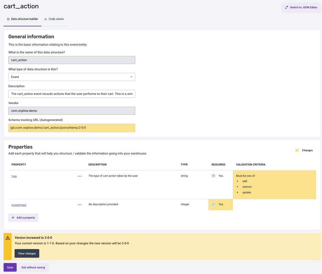 When you modify the data structure, the builder will mark your changes in yellow, and automatically determine the new version of your data structure based on these modifications. You can reset the data structure and erase all changes at any moment by clicking the Clear Changes button found in the alert beneath the properties.