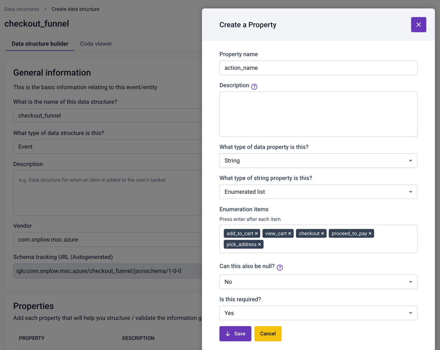 When creating a new data structure, you can add one or multiple properties. For each property, you can set a name, description, its type and a possible enumeration of allowed values (for type string). You can also set additional constraints to define if this property should be optional or mandatory, and if null values are allowed.