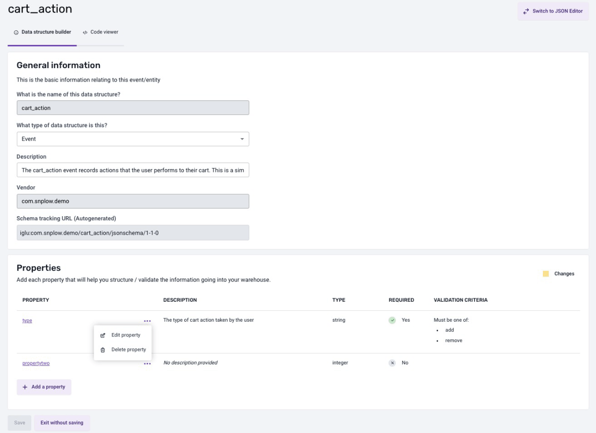 On the edit page, under the General Information panel, you can update the data structure type or its description. To add a new property, cick the "Add Property" button. To edit or delete an existing property, click the three dots next to the property name to open the action menu, and then select the appropriate option.