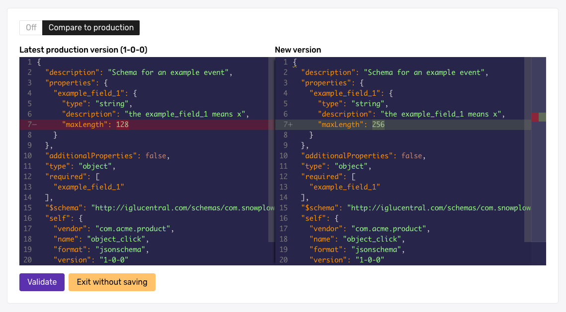 1-0-1to1-0-2. - Increment a major version to indicate a breaking change to the schema. In our example, this would increment the schema from