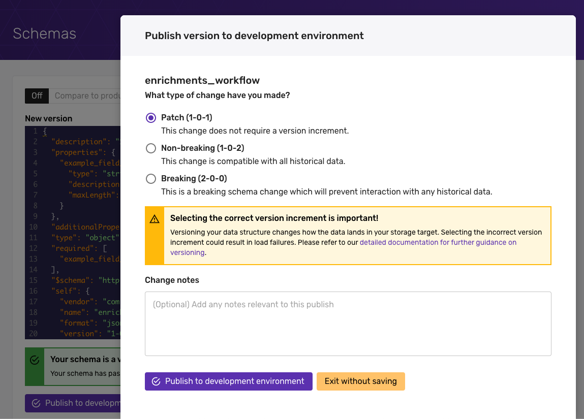 1-0-1to2-0-0. - Patch the current version, this will overwrite the existing schema without increasing the version. In our example, this would leave the schema at 1-0-1.