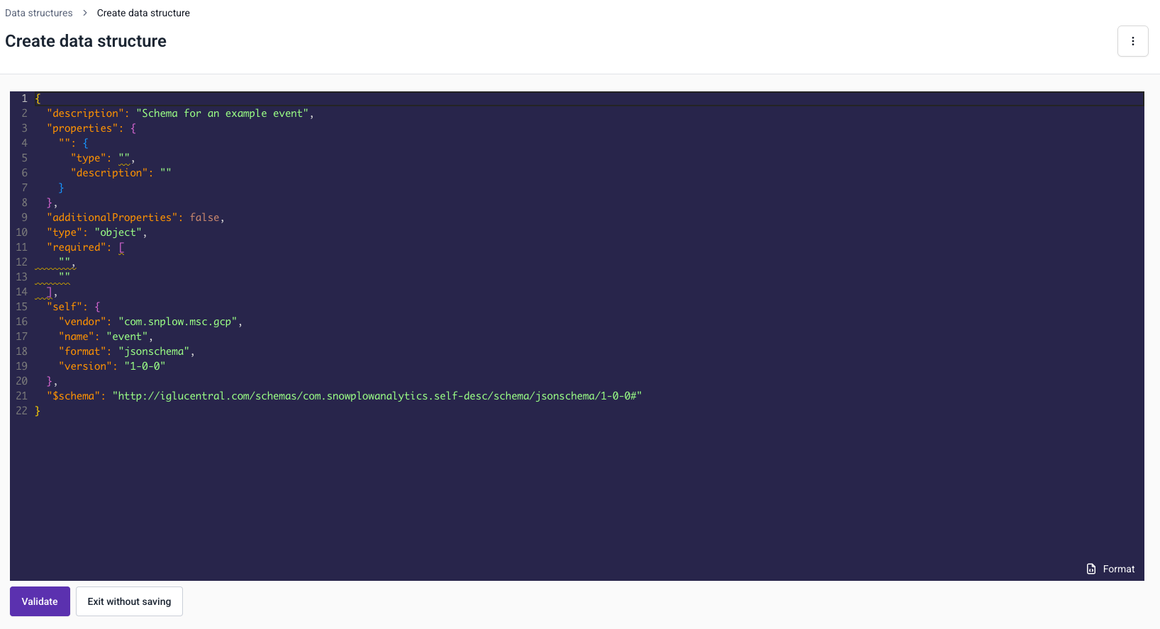 You can now write the first version of your JSON schema for this data structure. Some template JSON is provided in the code window to start you off. For comprehensive guidance on all supported JSON Schema features and validation options, see the JSON Schema reference.