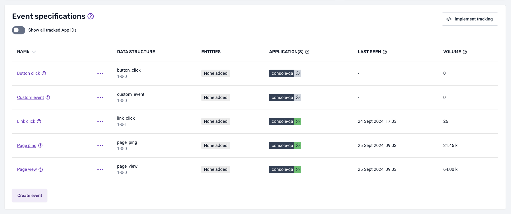 - A counter for each event specification, showing the total number of events detected from the tracked application IDs in the last 30 days.