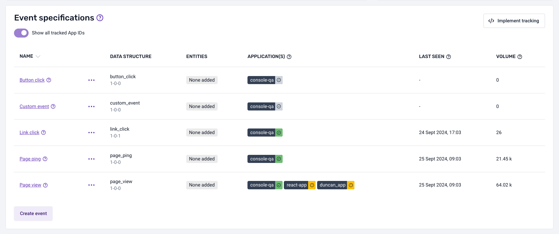- A list of application IDs from which events are being tracked, displayed for each event specification. For each application ID, a status will be shown with different colors: