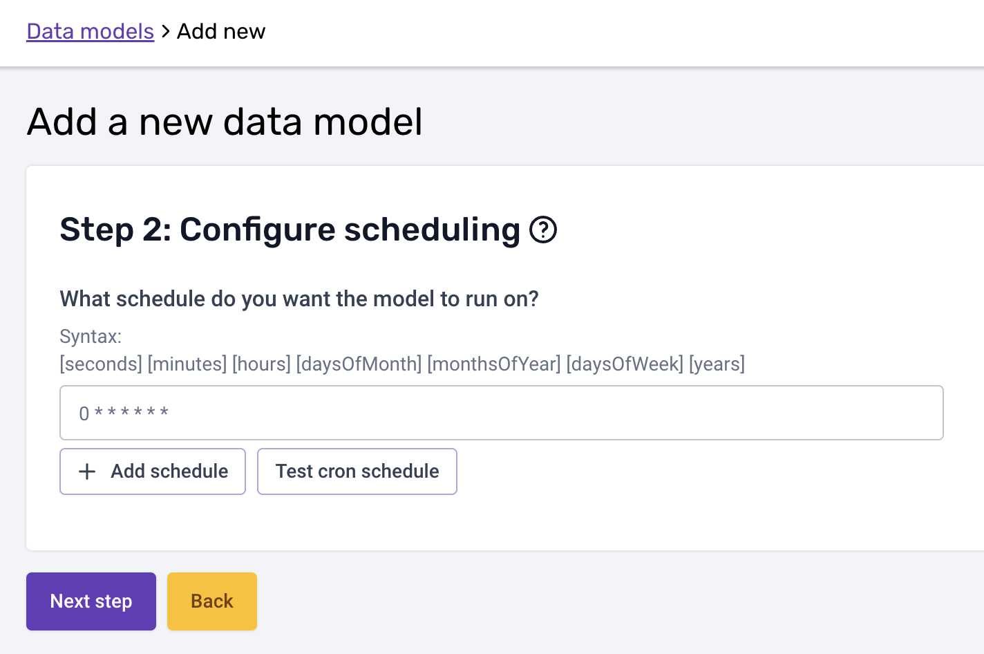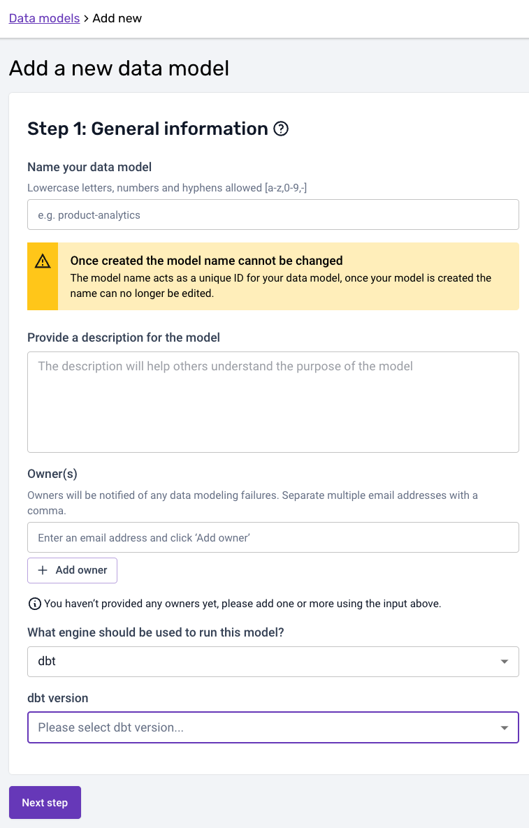 In the first step, you can provide the data model name, a description, and the owner(s) of the data model that will be alerted in case of failure. Finally select the engine and version that should run your datamodel (dbt in this case):