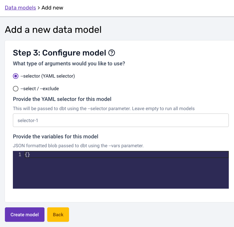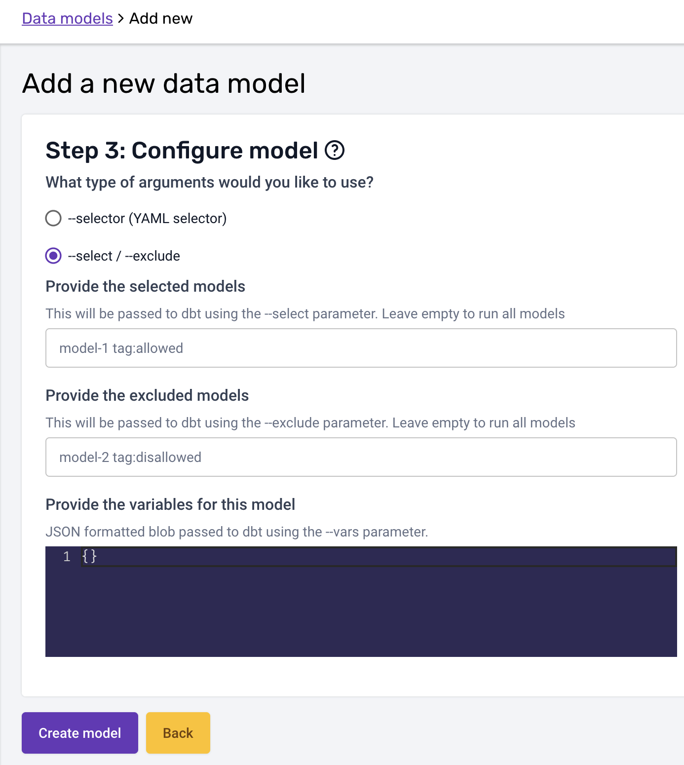 In the third and last step you can configure the arguments and variables your dbt run call is excecuted with. The arguments (--selector or --select / --exclude) follow the syntax described on dbt docs, and so do variables (--vars flag):