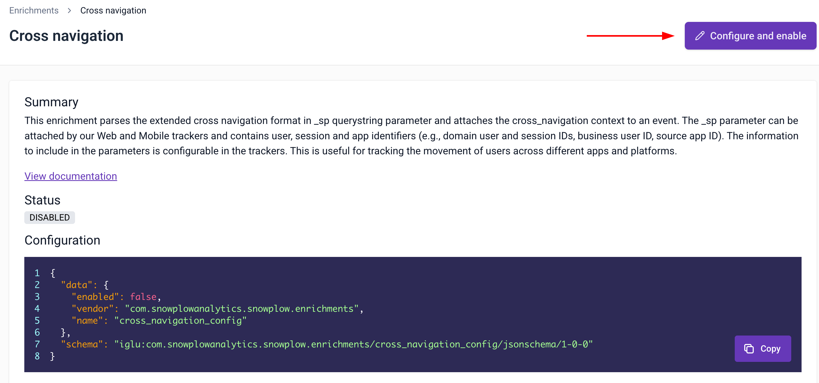 Navigate to a Snowplow Mini and locate the enrichment you wish to enable. In the listing select Configure and enable / Edit configuration from the pop up menu, or click the Configure and enable / Edit config button when viewing the enrichment.