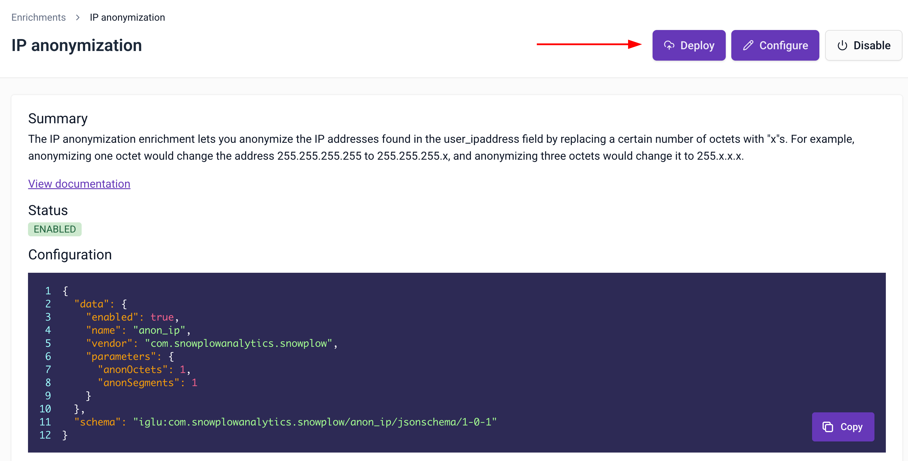 Navigate to the Snowplow Mini that you want to deploy from, and locate the Enrichment you want to deploy to another environment.