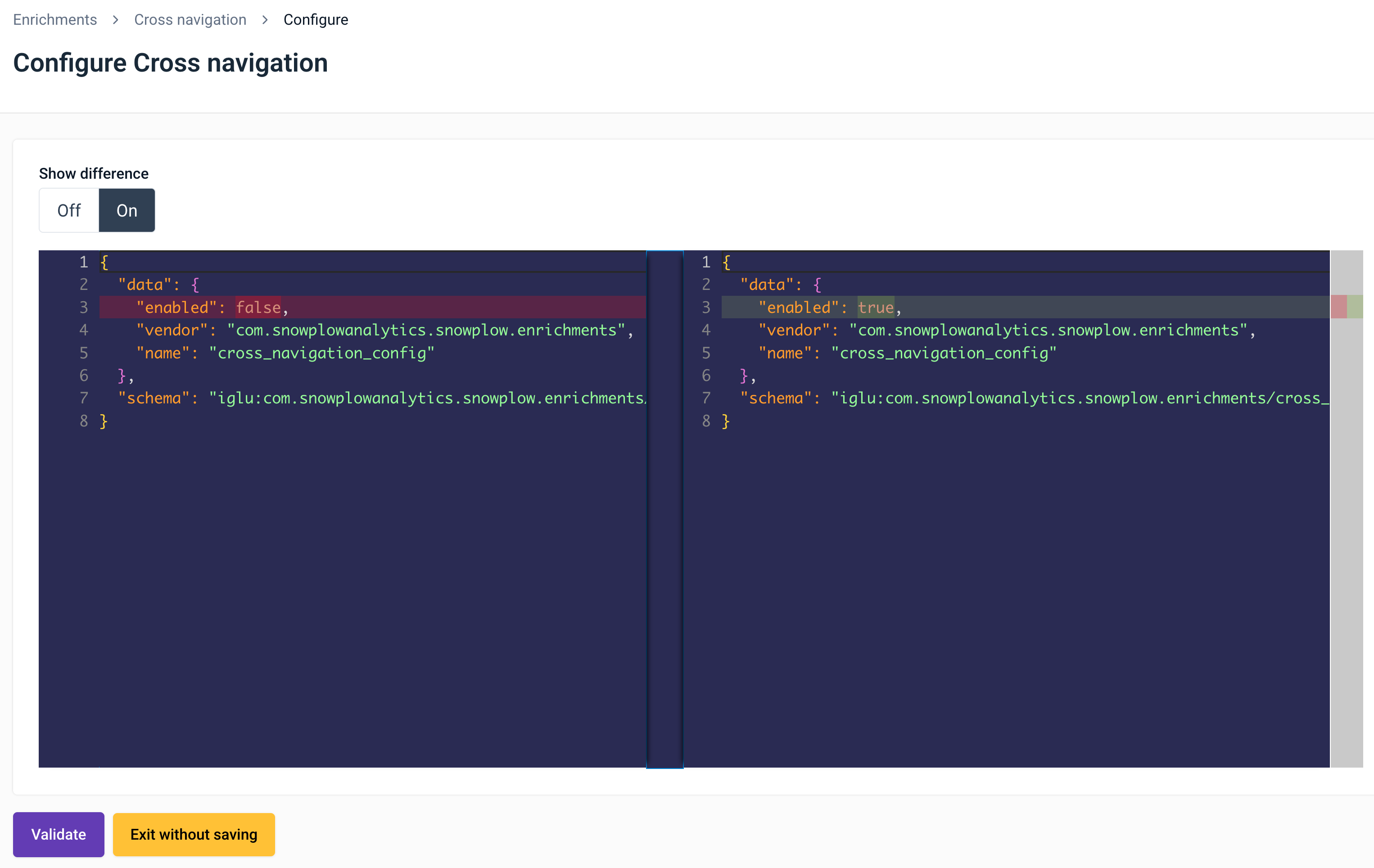 On the configuration screen, edit the JSON configuration (refer to each individual enrichments documentation for support) and click Validate.
