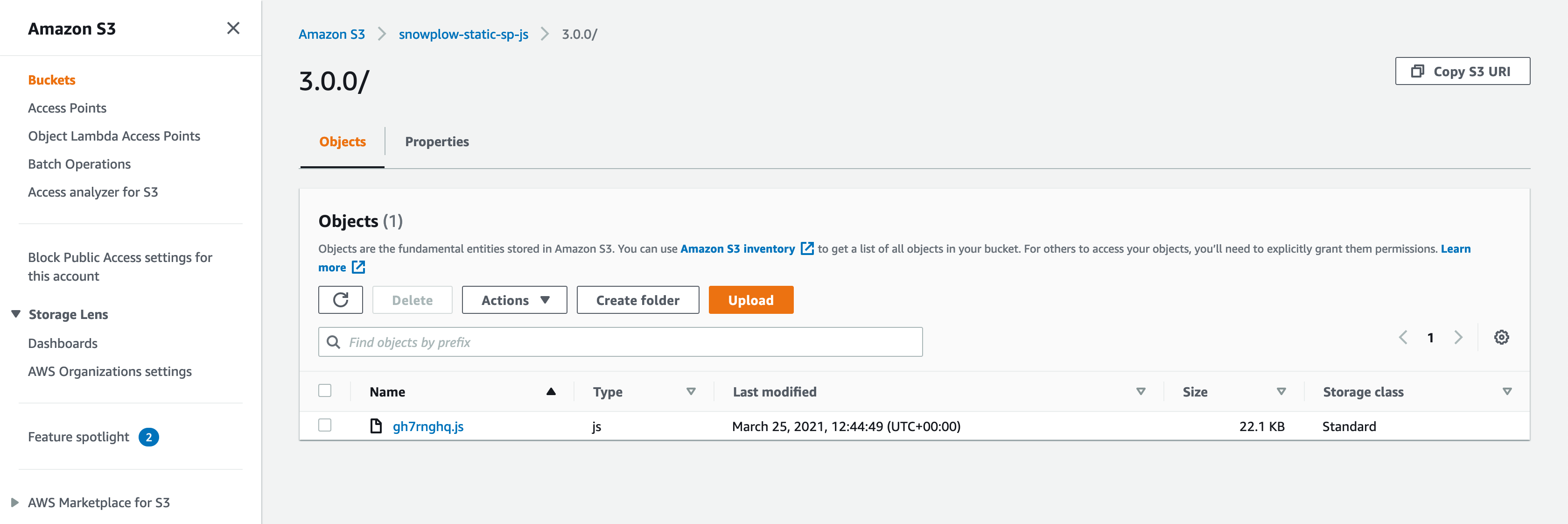You want to upload the minified version of the Snowplow JavaScript, which is called sp.js, that you downloaded in an earlier step. If you haven't downloaded it yet, you can obtain the latest version of the JavaScript from Github releases.
