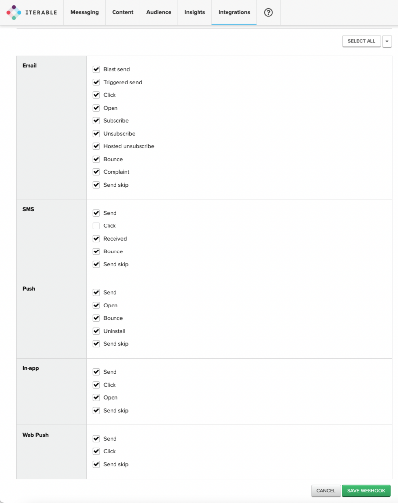 This webhook integration lets you track a variety of events provided by Iterable through their System Webhooks. The event types include email opens and clicks, sent SMS or push notifications, and more.