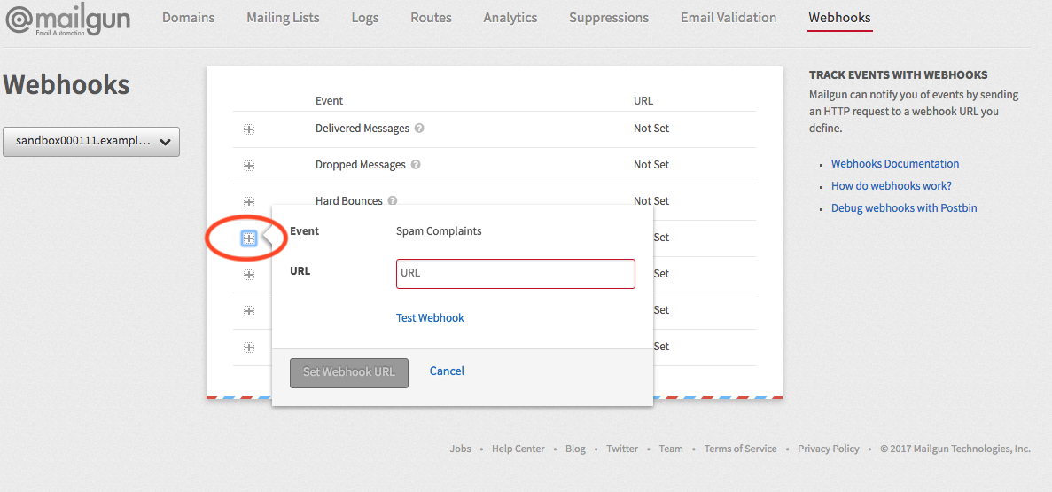 Finally click on Set Webhook URL. You can optionally click on Test Webhook to verify that your collector instance is reachable from Mailgun's servers.